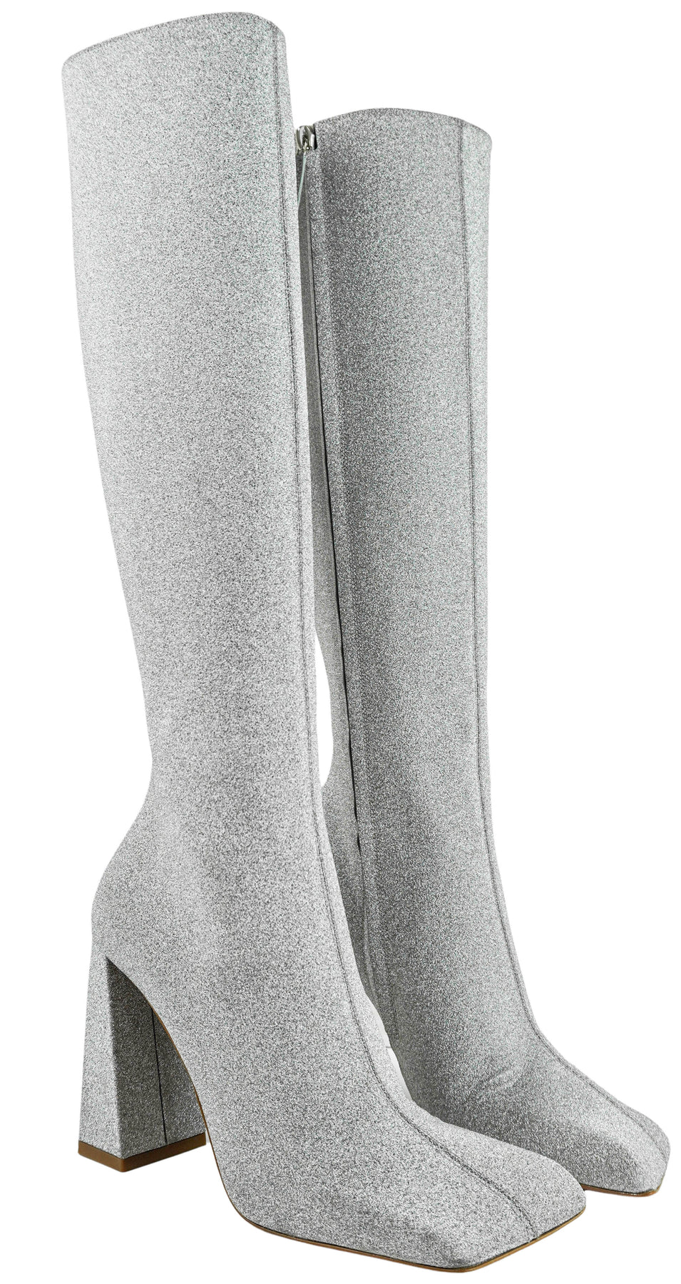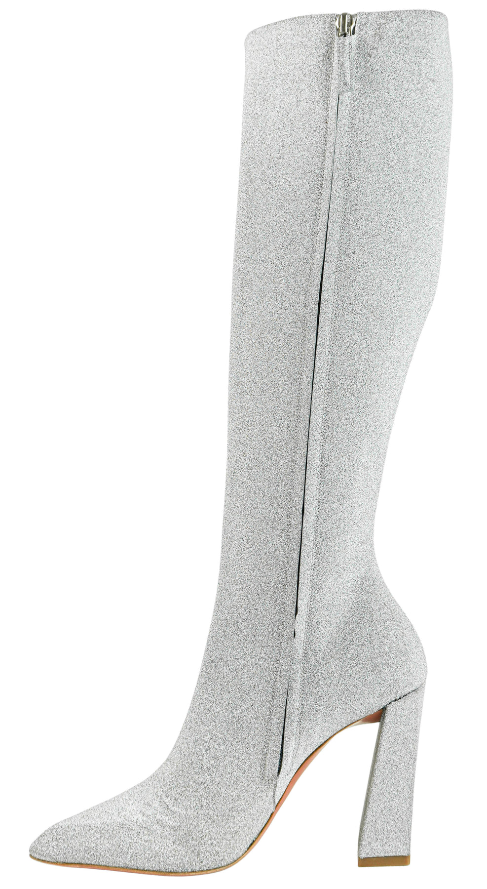 Amina Muaddi Marine Knee High Boots in Silver Glitter