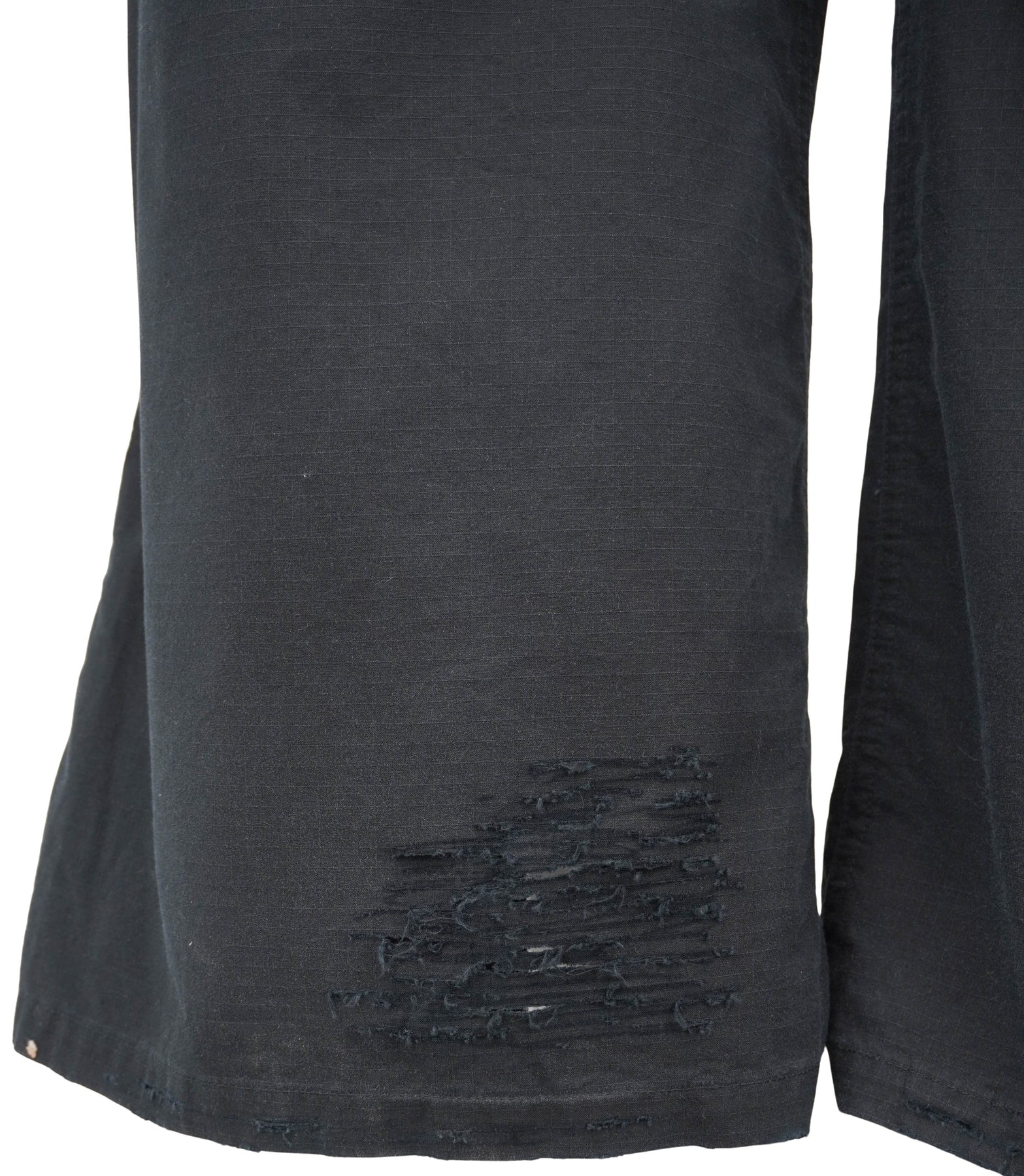 • Distressing to color and fabric throughout