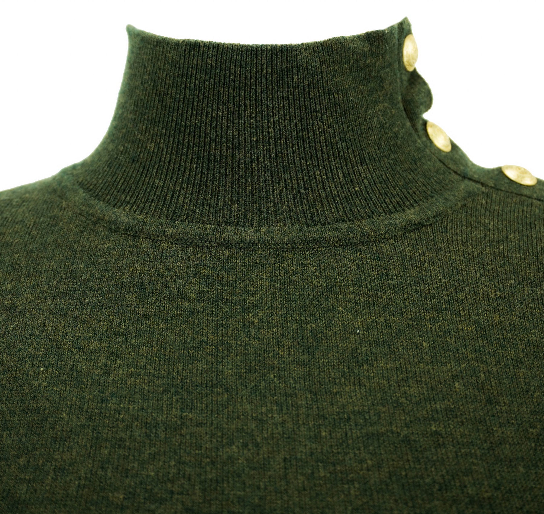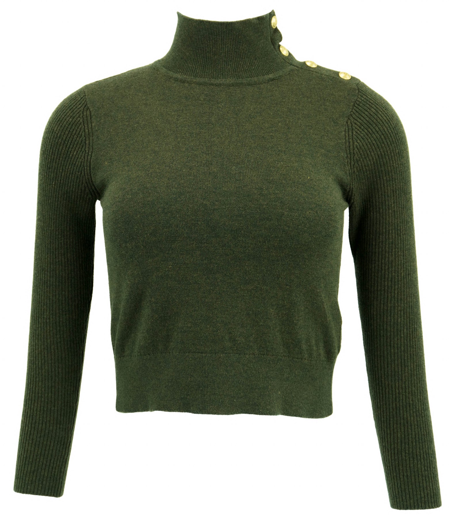 - Gold snap detail at neckline/shoulder seam
