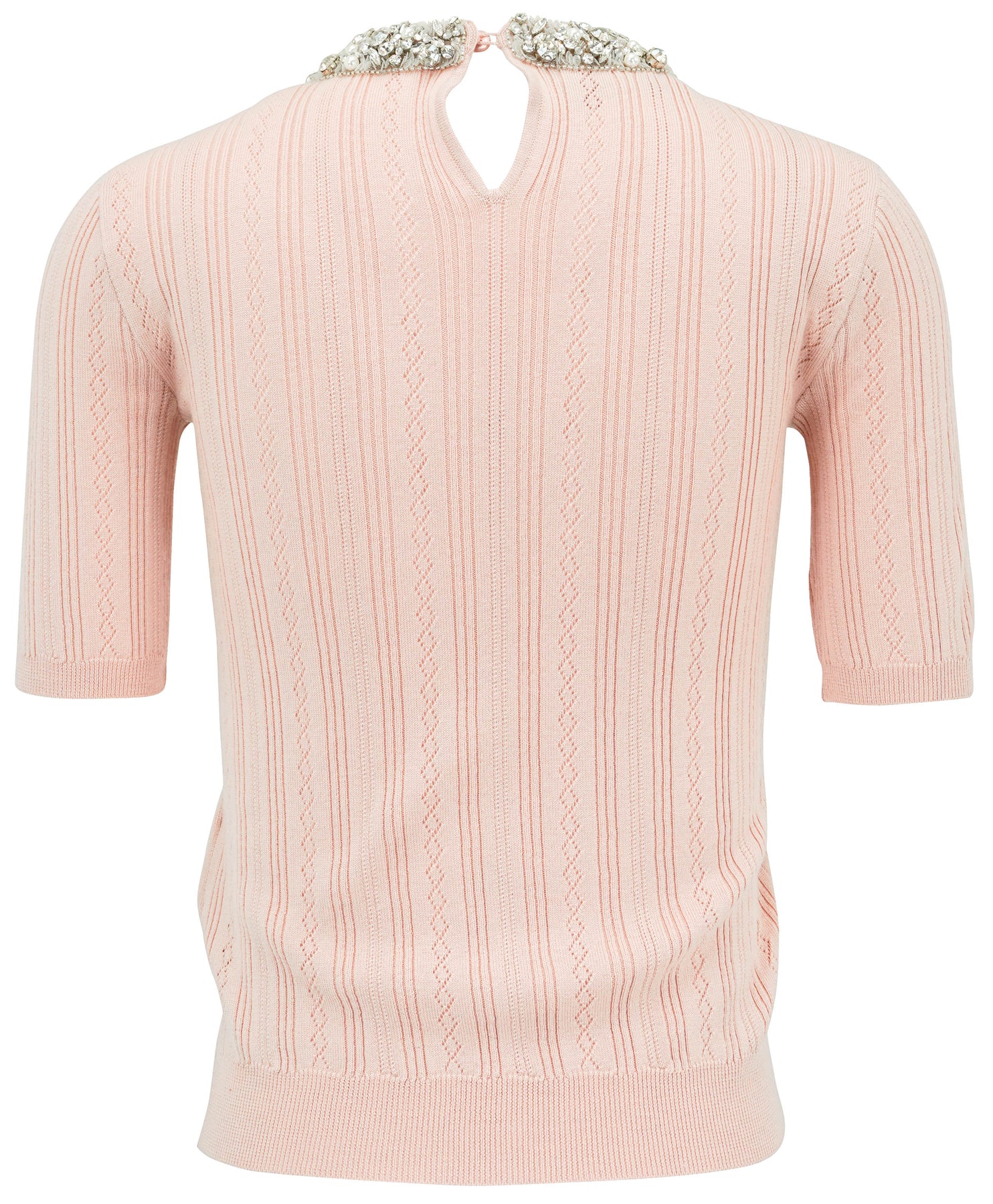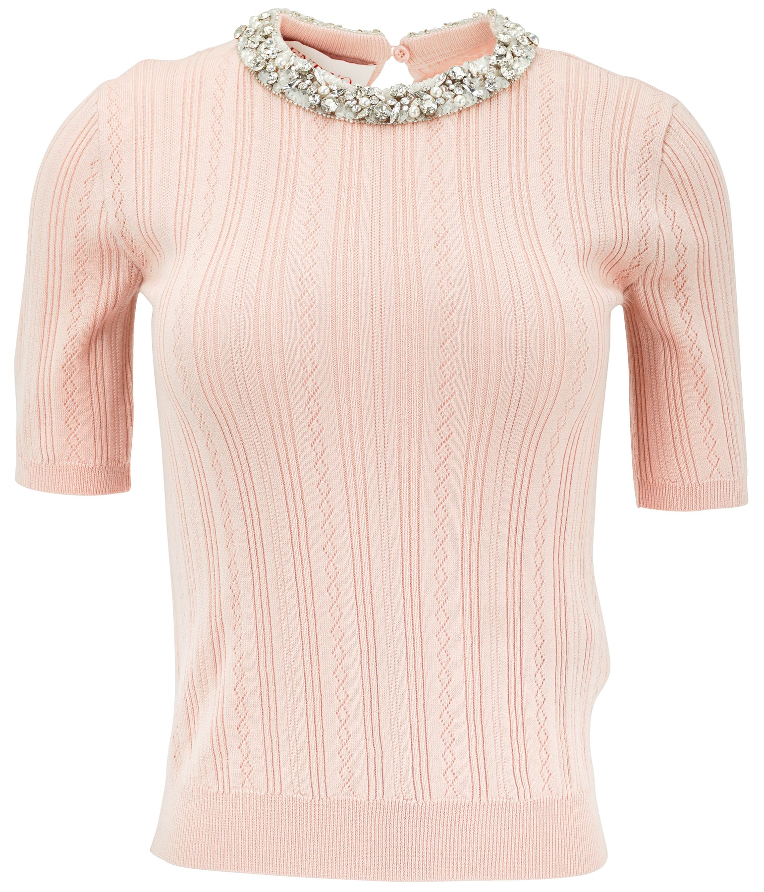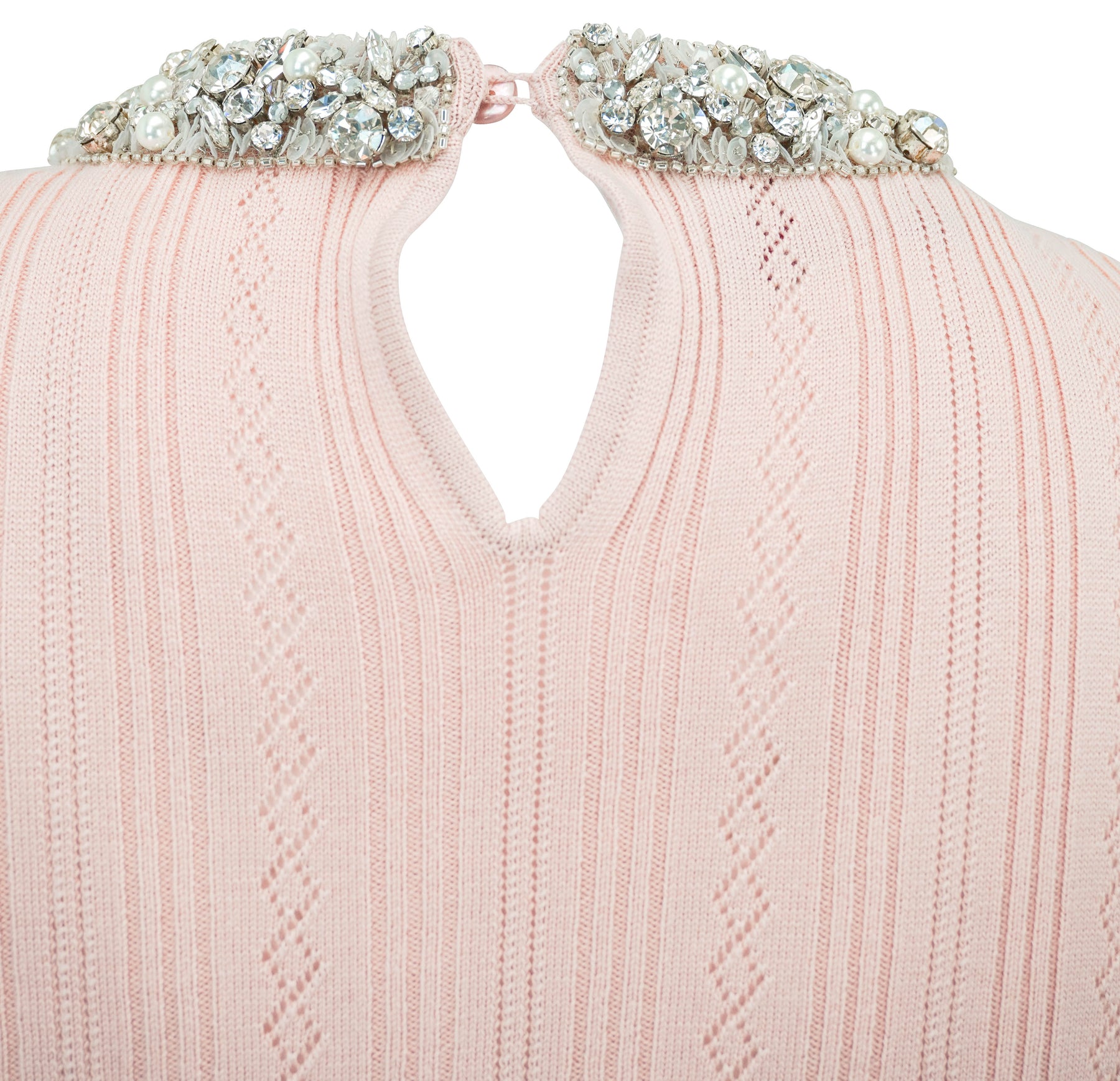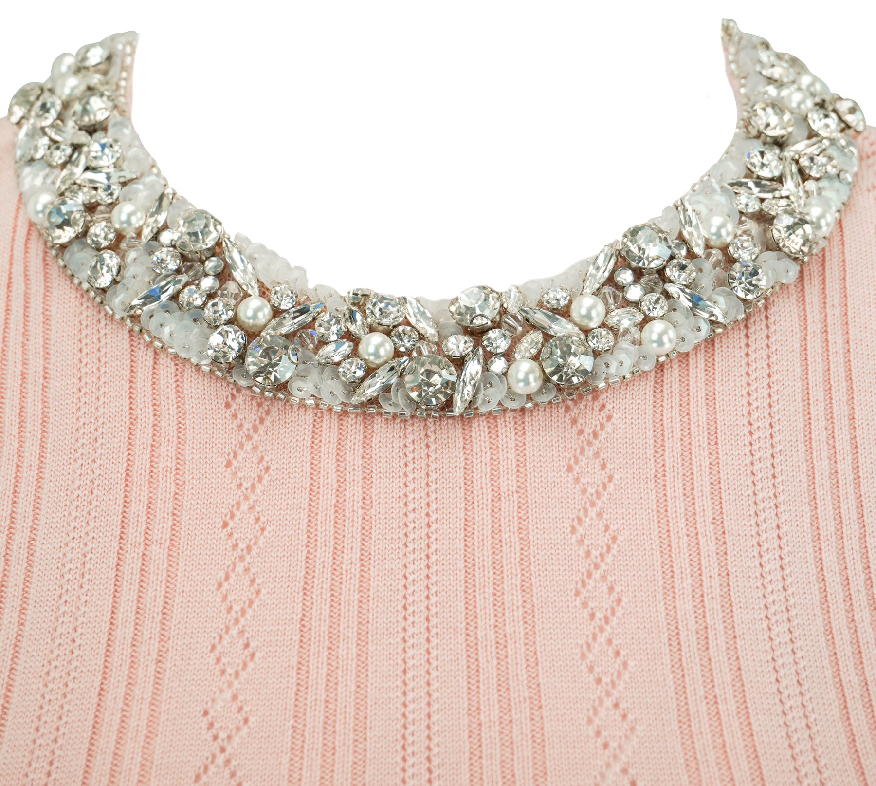 - Pearl, rhinestone and sequin embellishment at neck